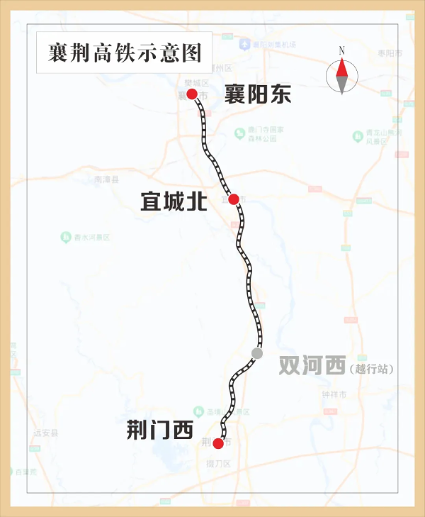 襄荆高铁全线设襄阳东、宜城北、双河西、荆门西4座车站,其中襄阳东为既有车站,荆门西、宜城北、双河西3座车站为新建车站,双河西为越行站,暂不办理客运业务。襄荆高铁建成通车后,襄阳和荆门间将实现1小时通达。